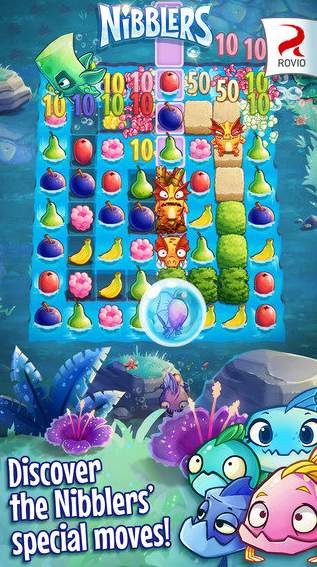 连线四个、五个,或者连线更多的水果,就可以招来珊瑚、八爪鱼及其他的 Nibblers。这些鱼,都身怀绝技、深藏不露。可以使用他们各自的特异功能,多吃水果,摆平蜥蜴,排除障碍。