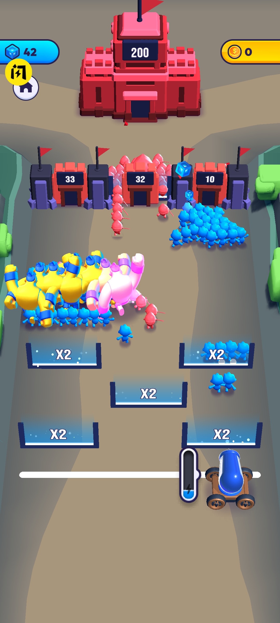 颜色大作战游戏是一款休闲策略闯关游戏。游戏采用3d卡通画风,玩家需要带领自己的士兵,努力的攻占敌人的城池,赢得战斗的胜利。玩家需要利用大炮等武器喷射大量的士兵,带领这些士兵进攻敌人。行动路线中会出现倍增门帮助玩家增加士兵,也会有障碍物消耗士兵,玩家需要及时做出策略上的应对,保持优势乘胜追击。感兴趣的玩家快来下载游戏,一起开启一场游戏之旅吧!
