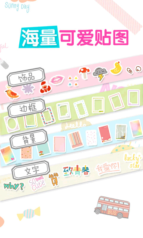 3、全新整理的可爱拼图风格,做到了用“文字 ”萌动心情,随时分享你的美图日记。