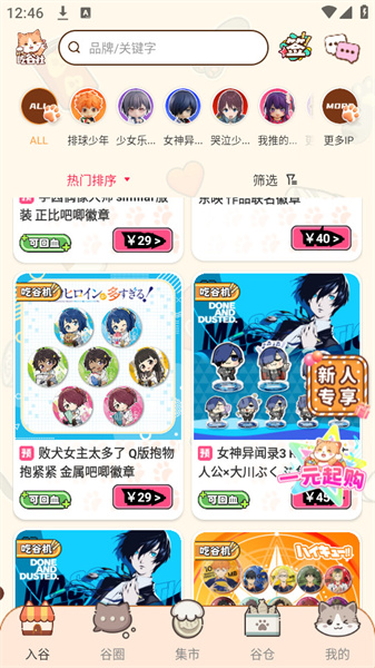 欧气吃谷社app是一款以二次元周边实物道具为主题的商品平台,在这里提供了与二次元相关的手办、热门模型、珍藏卡牌、潮玩盲盒等商品。你可以选择自己喜欢的动漫ip,在搜索框中通过关键词搜索,找到自己喜欢的二次元品类,找到所有的动漫周边产品。所有提供的二次元周边都是来自日本的正版货品,在购物之后,可以直接网上支付,并且可以通过各种物流送到你家门口。