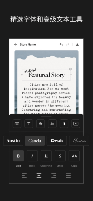 2、使用工具包、编辑器和设计师来创建各种字体和文本的故事拼贴,支持照片和视频的添加。