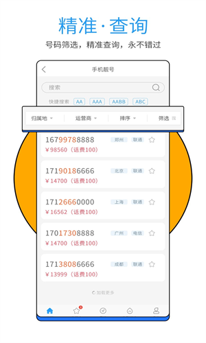 2、建立千万级号码资源库,提供8种维度筛选器与智能推荐算法,支持号码收藏夹跨设备同步功能。
