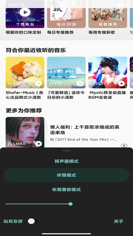 2、能够将需要播放的音乐转换为听筒模式,不会打扰到其他人。