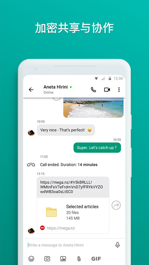 3、多端同步:聊天记录自动同步,聊天窗口可直接添加本地文件或调用MEGA云盘资源。