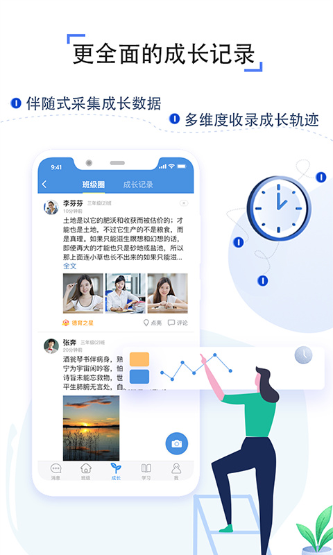 3、可随时随地进行班级圈分享、互动,孩子在家与校穿梭时的学习和生活状况尽收眼底。