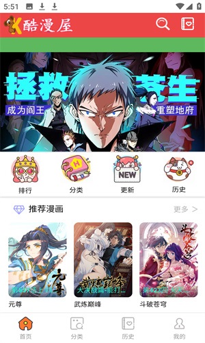 1、首先打开酷漫屋app,进入软件后点击界面下方的【历史】。
