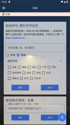 3、选择自动评论的视频类型,如动画、漫画、游戏等,应对各类视频评论需求。