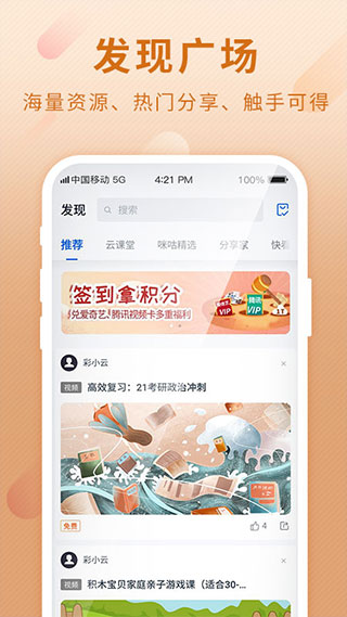 和彩云现在已经更名为中国移动云盘,这是移动旗下的云存储软件,手机中的文档、相片、视频都可以上传到云端,设置自动备份功能,每天定时备份文件数据,即时手误删除文件也能直接从云端复原,重要的手机文件数据永不丢失。支持链接分享文件,不需要蓝牙、不用连接数据线,文件分享更轻松便捷。支持家庭云服务,只需与家人的和彩云进行绑定,全家人即可共享云盘中的文件,省去繁琐的链接分享转存流程,让数字生活更加便捷美好。