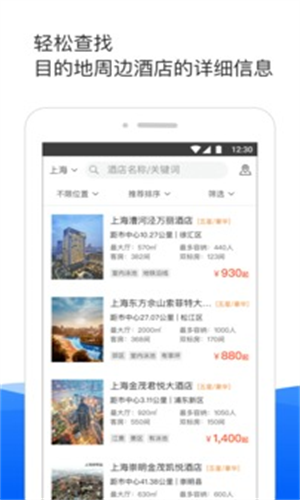 2、搜索栏一键智能搜索,用户直接输入酒店名称或者关键字都可以快速找到合适地点。