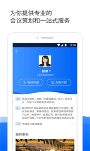 1、支持线上预订,提供上百个热门城市的数百名专业会议顾问,帮助您获取活动方案。