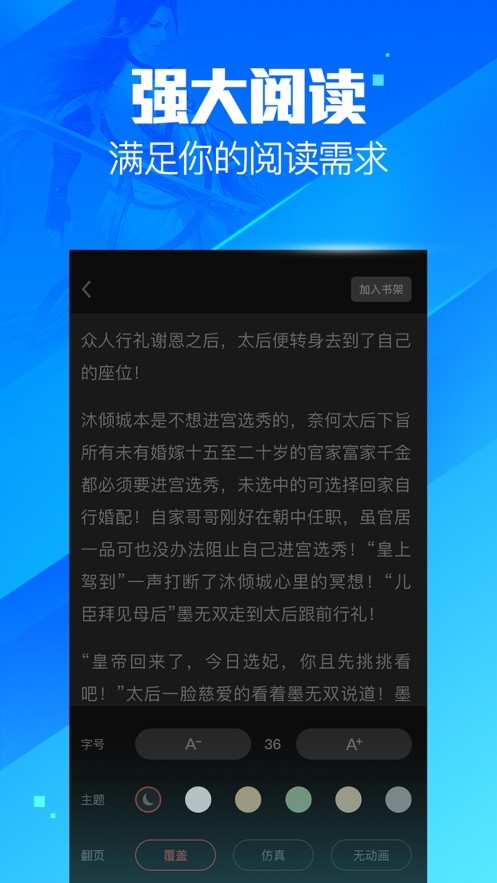 【高清设置】护眼模式、仿真等多翻页效果、自定义阅读设置,统统帮你搞定;