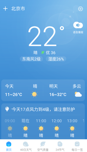 3、独特的语音播报天气信息的功能,通过耳朵就能快速了解各地区天气,还支持自定义播报时段。