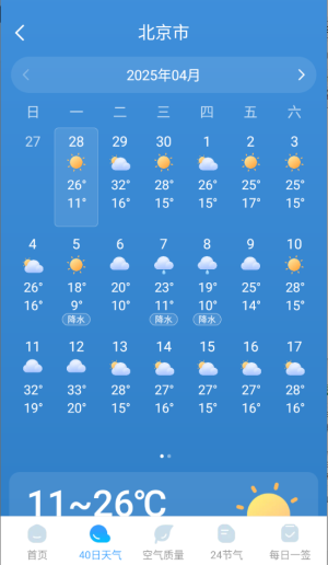 1、软件提供超长的天气预报周期,支持长达40天天气趋势预测,打破行业常规15天预报限制。