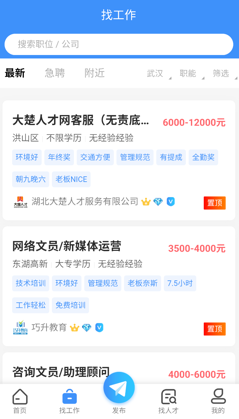 大楚人才网汇聚海量湖北高薪好工作,这里为每个岗位都带来了详细的描述,让求职者通过手机就能了解岗位的工作内容、薪资待遇、工作环境等,真正做到找工作时心中有数。清晰的岗位分类板块,方便求职者根据岗位信息筛选,快速寻找心仪的工作。