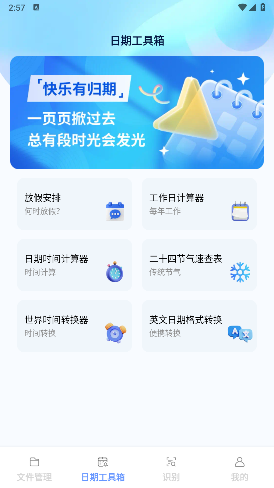 轻享工具宝箱App是十分好用的手机工具箱,涵盖文件管理、日期计算、放假安排、格式转换、扫描识别等功能,集合多种不同类型的实用工具都可免费使用,完全无需下载即可使用,可以满足用户的不同使用需求,快点下载吧!