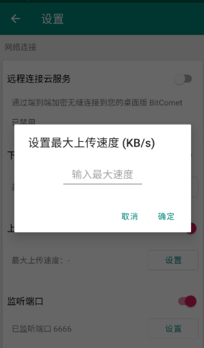 4、在弹出的设置最大上传速度页面中,输入您想要的最大上传速度,最后点击“确定”按钮即可