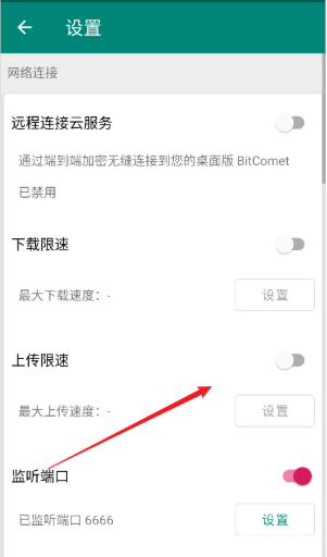 3、进入设置界面后,找到上传限速选项,打开右侧的开关,点击“设置”按钮