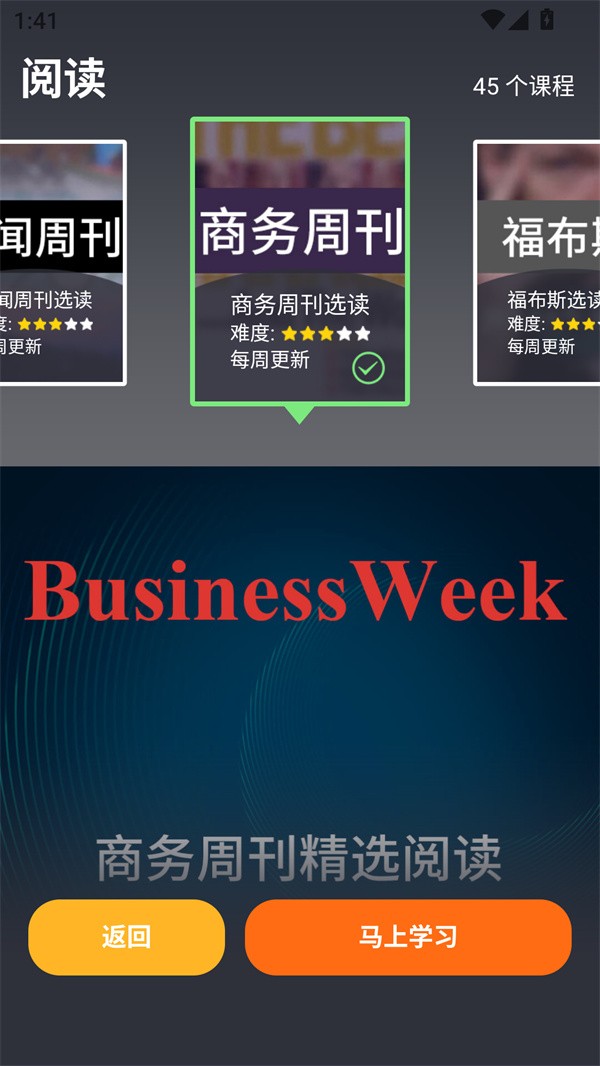2、阅读板块呈现45种读物,如每天读一点英文标注难度和单元数,方便学习者选择适合自己的内容