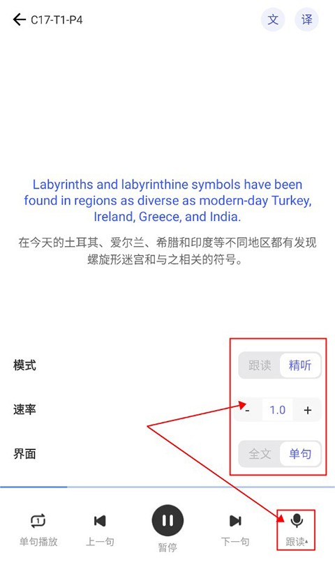 4、进入跟读页面后,可以在右上方进行英文显示以及翻译设置,打开后英文就会显示,并且还有中文翻译,点击下方的播放系统就会自动播放,用户跟读即可,左右两边还可以切换句子,方便用户回顾以及加快跟读进程