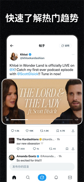 2、以帖子、推文的形式将海外的新话题展示给网友,还可以获得所有带有评论的实时新闻和视频交流。