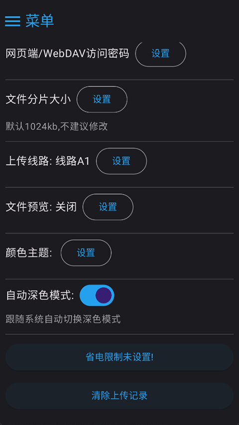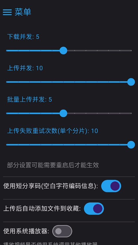 答:进入app页面点击右上角“菜单”->"设置",即可调整上传下载并发数量等功能。