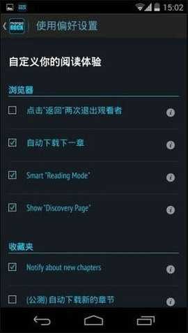 4. 阅读漫画:点击选择漫画,进入阅读界面。根据需要,可以调整页面布局、翻页方式、字体大小等设置。