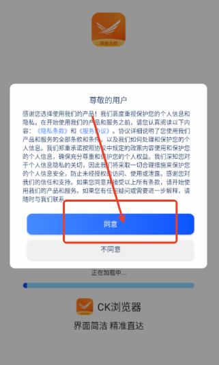 1、下载安装CK浏览器app,之后在手机上打开,同意相应的权限