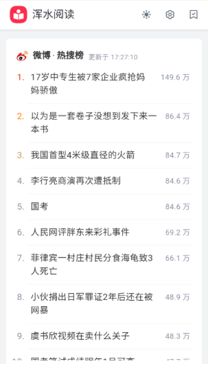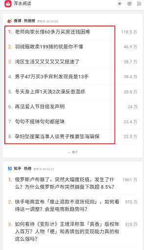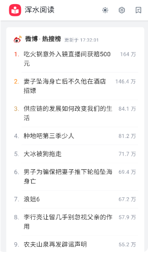 浑水阅读是一款新闻资讯阅读软件,集合了诸多媒体平台信息,提供给用户微博、知乎、今日头条等诸多平台的热搜,让用户能够及时的了解自己感兴趣平台的新闻;用户可以在软件中阅读各种新闻资讯不用重新切换新的软件,用户使用非常的便捷。
