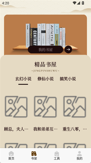 2、打开进入软件,进入“书架”板块,提供搞笑,修仙,玄幻等小说类型题材