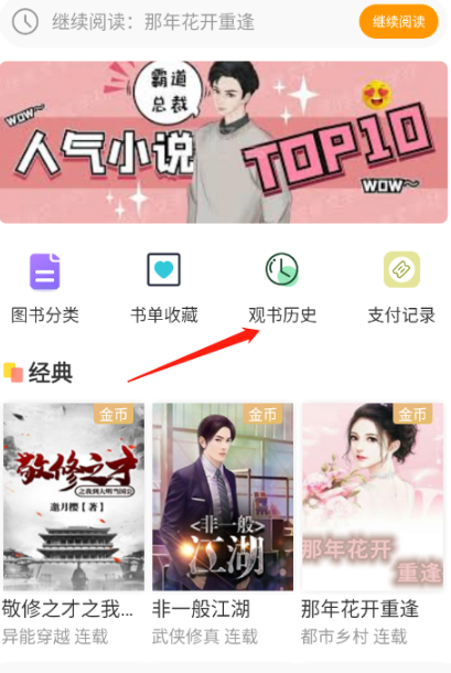 1、进入到首页点击“观书历史”