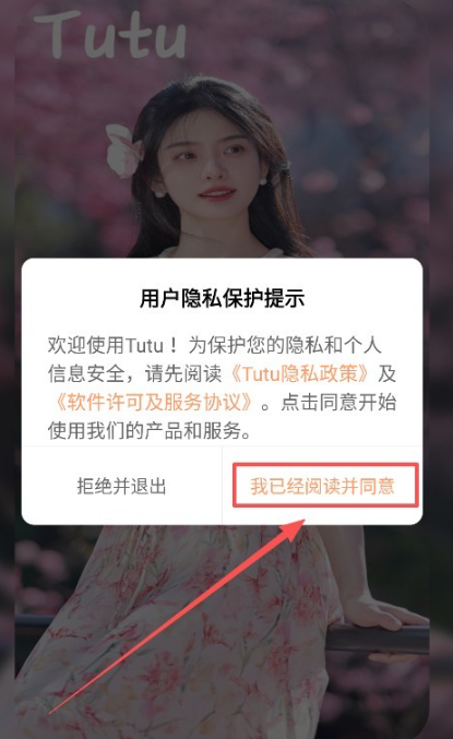 1、打开Tutu小说,同意相关的隐私规定继续使用