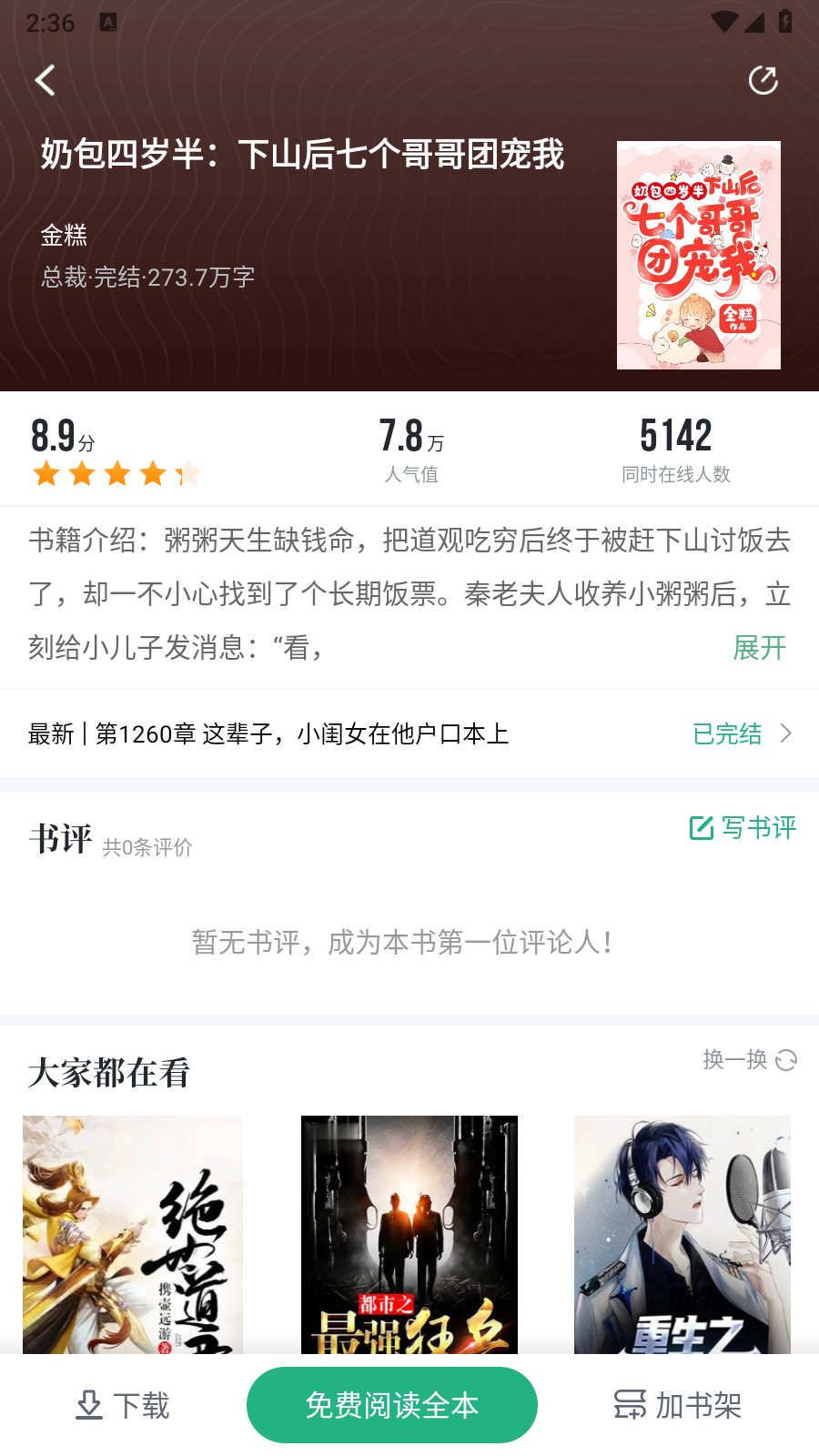 3.点开想看的小说进入详情页点击“免费阅读全本”