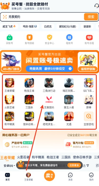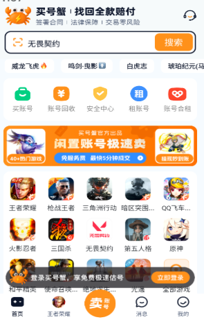 买号蟹是一款游戏账号交易软件,不管是卖号,买号,估价,还是租赁都能一站式完成;内部还为用户提供很多丰富的账号资源用户可以自由的选择喜欢的在手机上进行交易,整个交易过程非常的安全不会泄露用户的个人隐私,用户可以放心的使用。