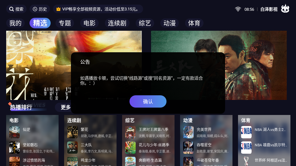 3、多种影视分类频道内容,提供精选、电影、连续剧、综艺、动漫、体育等频道;