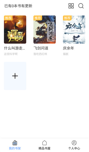 1、用户打开奇墨小说,进入首页,在我的书架页面,用户可查看推荐书籍和有更新的书籍,点击个人中心。