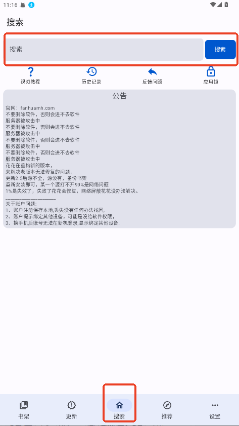 想在繁花漫画内搜索漫画,只需要在底部搜索栏的上方搜索框内输入漫画名或者作者名,点击搜索。